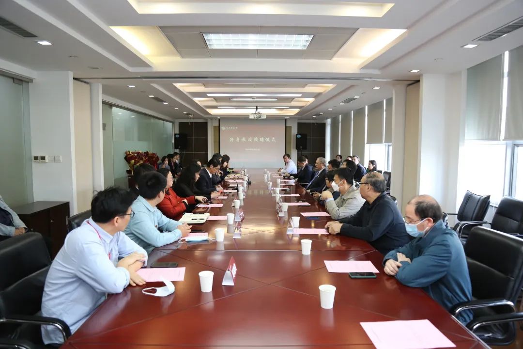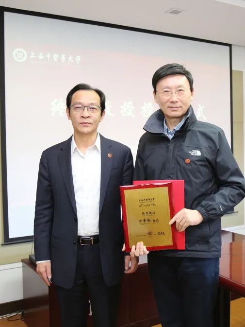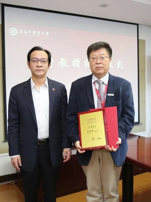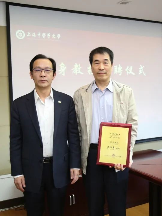 仪式上,季光为受聘的四位终身教授颁发聘书和铜牌,来自基础医学院、科技人文研究院、中药研究所、针灸推拿学院的教师代表为终身教授献花。
